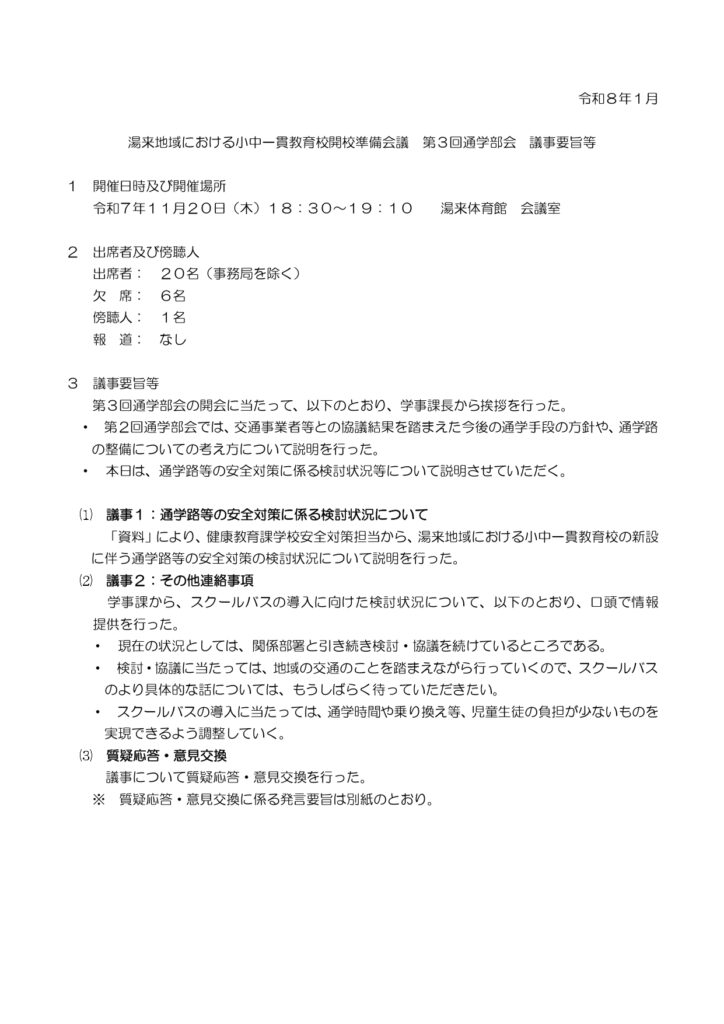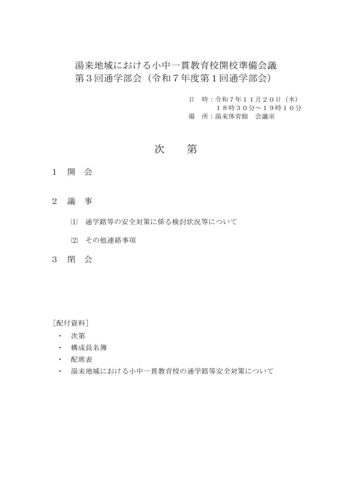 2025年11月20日 第3回通学部会 会議資料・議事・発言要旨 投稿者: minochi-20050425 | 2026年1月28日 0件のコメント 251120通学部会3.pdfダウンロード 第3回通学部会_議事要旨pダウンロード 第3回通学部会_発言要旨pダウンロード