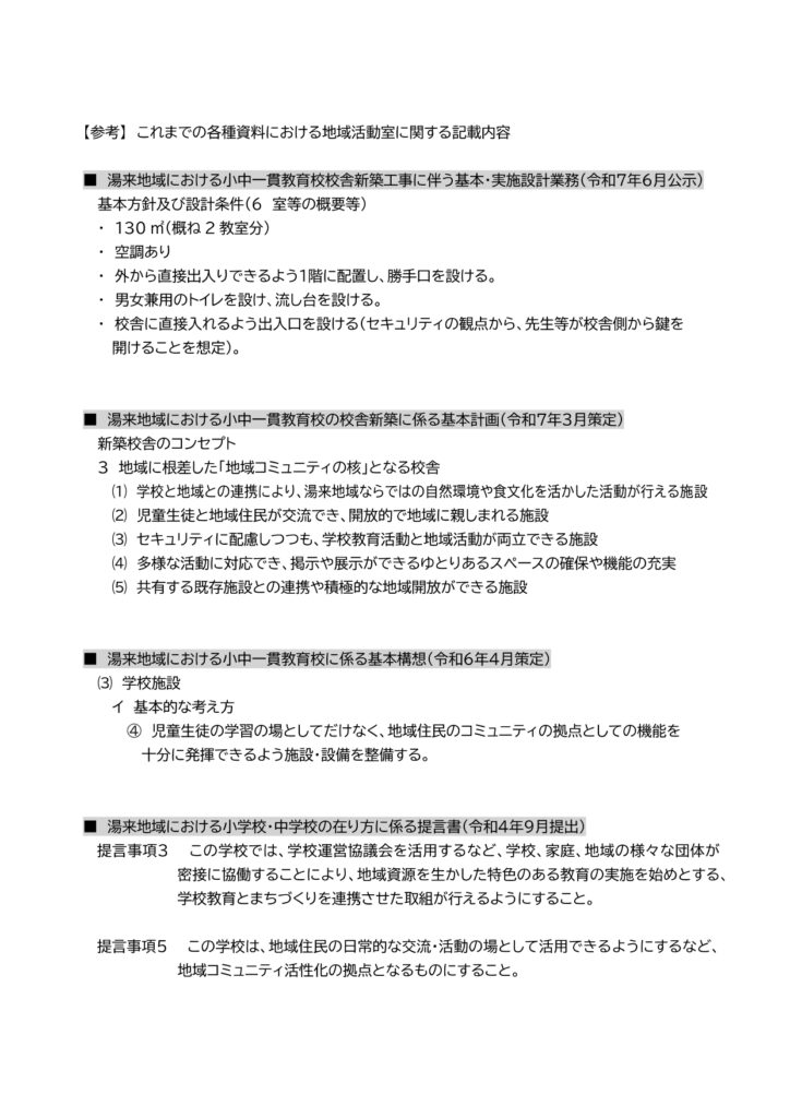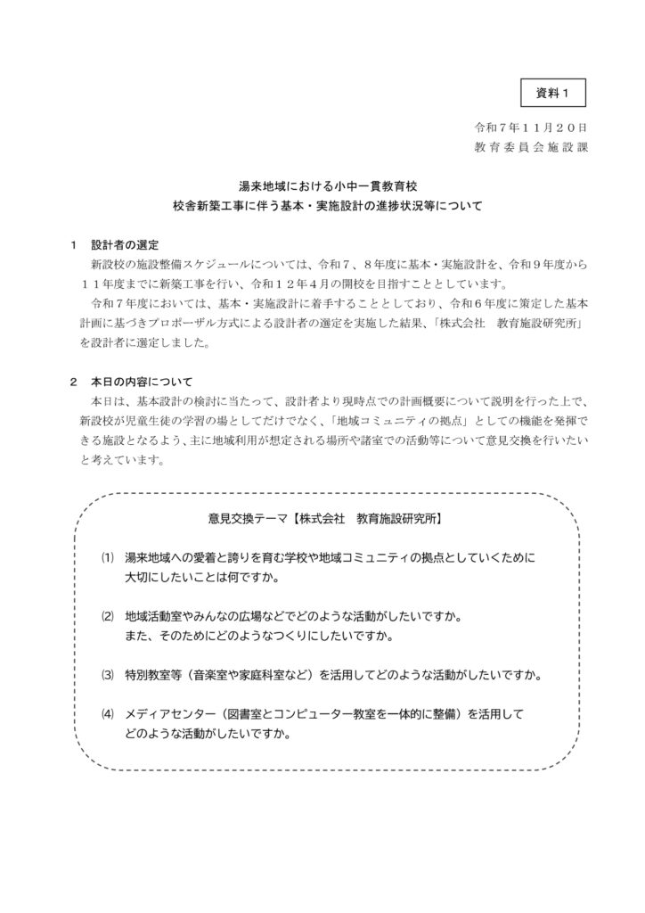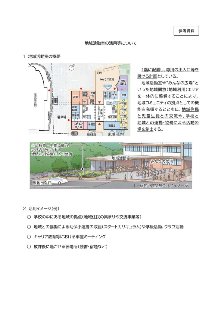設計者が作成したイメージから、より具体的にどういったものが地域として、保護者として、湯来の一貫校にふさわしいか、必要かという点を意見として出していくのが、会議の役割かと考えております。